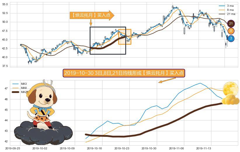 形态多维评估: ⚀ 2019-10-11日-2019-11-18日显现 3日-8日-21日均线 【烘云托月】买入点 看多信号,后市看涨,买入