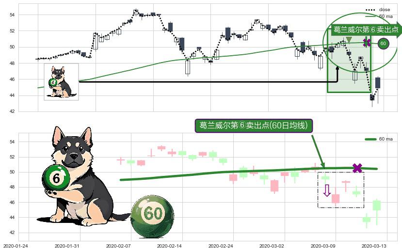形态多维评估: ⚀ 2020-03-06-日显现 葛兰威尔均线 60日均线 第⑥卖出点 走势反转见顶信号,后市看跌,卖出信号