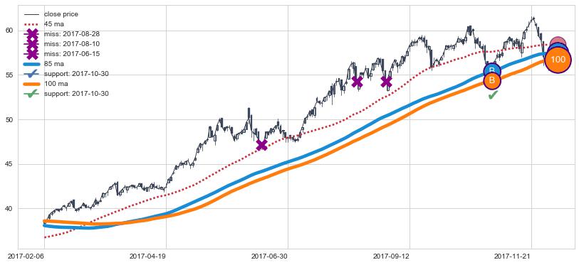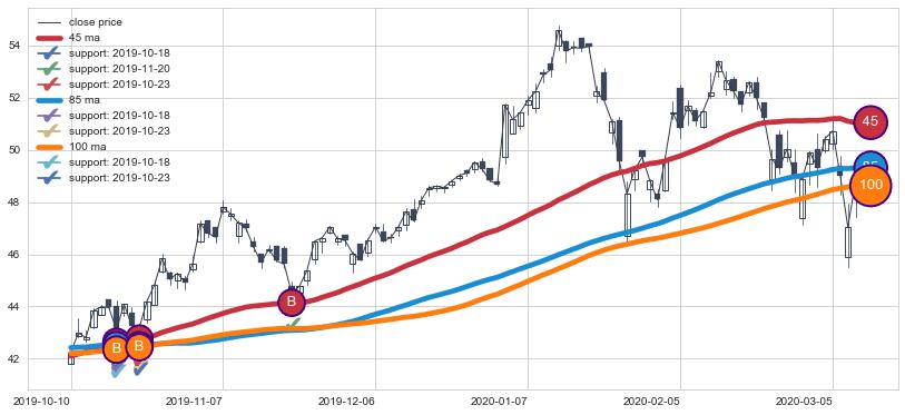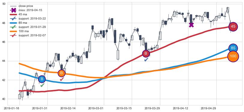 上涨趋势2019-01-16-2019-05-06,均线100, 85, 45确认关键支撑3处