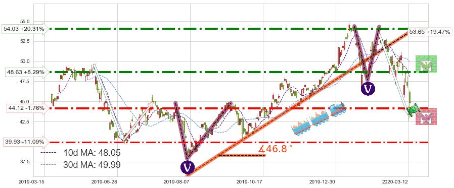 ♘ 支撑价格位44.12,可信任强度76.58%,距离最后交易2020-03-13形成的收盘价格44.91相差 -1.76%
