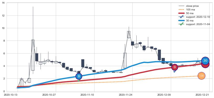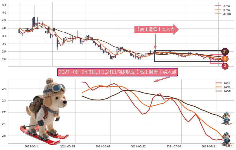 ⚀ 2021-05-27日-2021-07-23日显现 3日-8日-21日均线 【高山滑雪】买入点 看多信号,后市看涨,买入