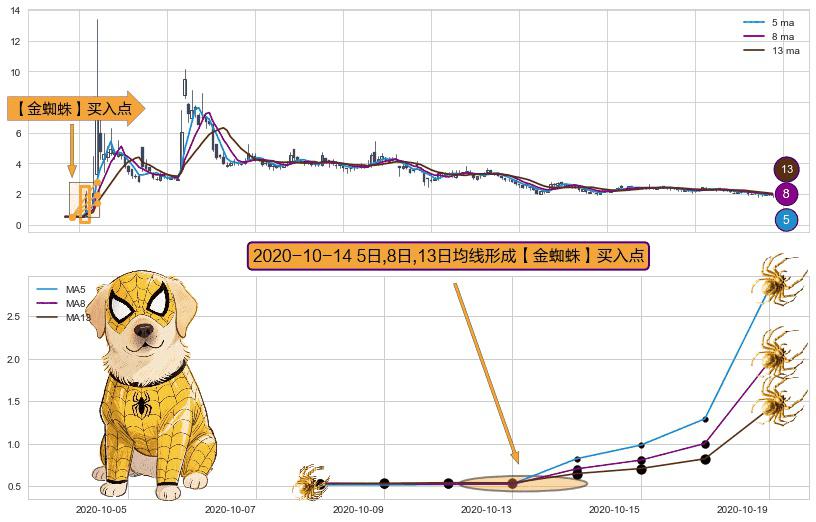 ⚀ 2020-10-14日显现 5日-8日-13日均线 【金蜘蛛】买入点 看多信号,后市看涨,买入