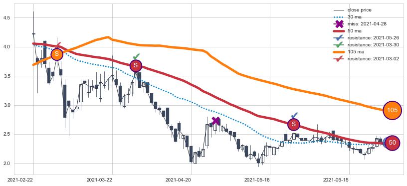 ⚄ 价格在均线遇到阻力后已再次向下回落了【较长】距离, 第⑦卖出点 阻力效果得到【初步确认】