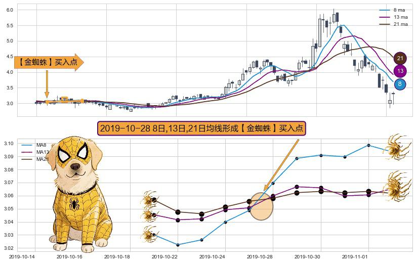 ⚀ 2019-10-28日显现 8日-13日-21日均线 【金蜘蛛】买入点 看多信号,后市看涨,买入