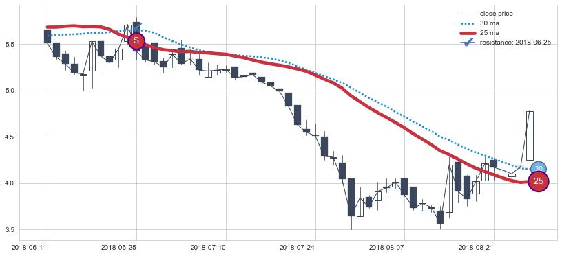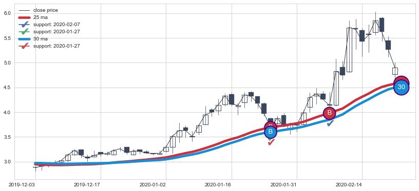 ⚀ 中期均线MA20下穿长期均线MA30形成的交叉是标准 死亡交叉