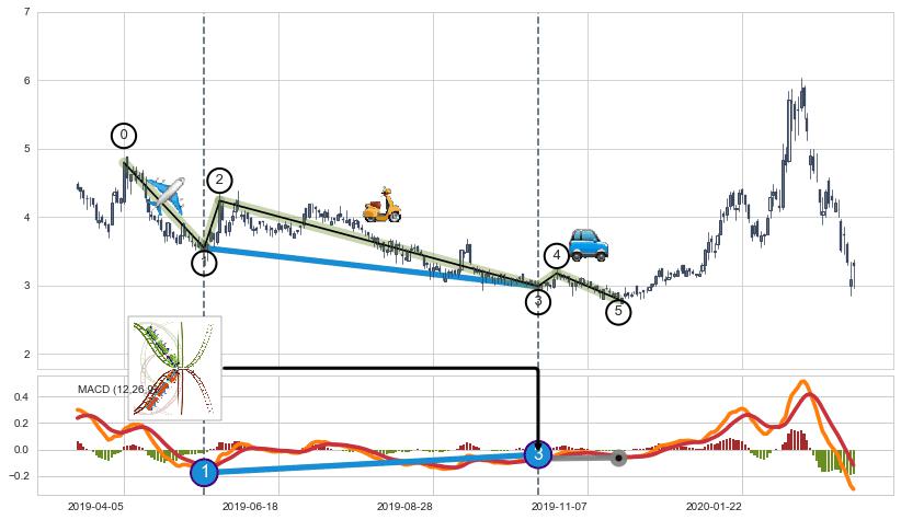 | 2 🅚:塔形底 | 圆底 ➕ 🌊:波浪理论猜想下跌浪5已形成,猜想后续形成abc反弹上涨(均值回复) ☞ 看多信号 ⇥ 【🅚线】交织【图形】⇥ 综合量化分数: 52 | > |