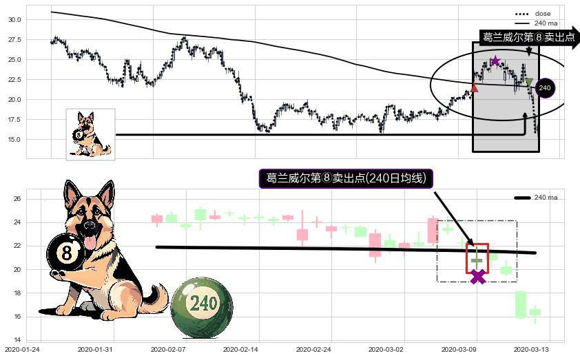形态多维评估: ⚀ 2020-03-09-日显现 葛兰威尔均线 240日均线 第⑧卖出点 下降趋势的中继信号,后市看跌,卖出信号