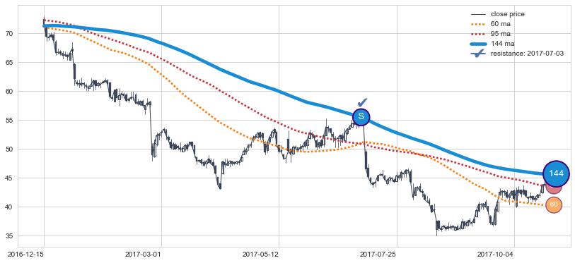 下跌趋势2016-12-15-2017-10-23,均线144确认关键阻力1处