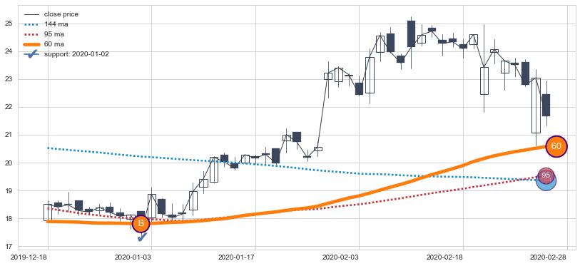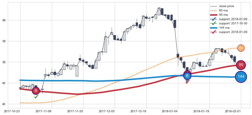 上涨趋势2017-10-23-2018-02-01,均线144, 95确认关键支撑2处