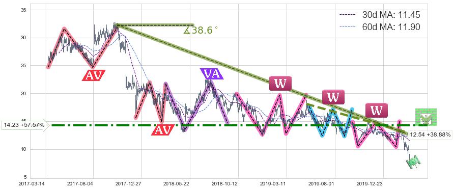 从2017-10-13至2020-03-13,共包含607个交易日,阶段股价下跌-93.66%,阶段股价变动位移路程比: 1 : 14,下跌趋势角度: 38.6