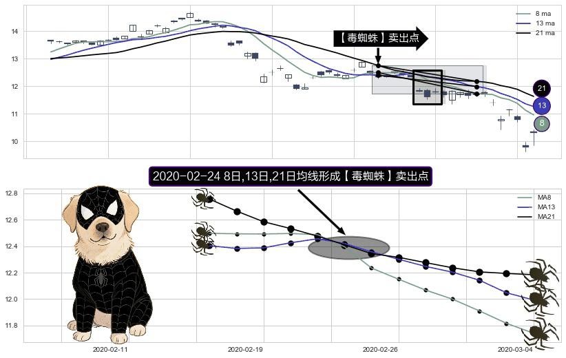 ⚀ 2020-02-24日显现 8日-13日-21日均线 【毒蜘蛛】卖出点 看空信号,后市看跌,卖出
