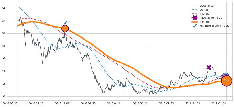 ➢ 最优均线组合共正确确认支撑阻力信号8处,正确确认率 53.33%