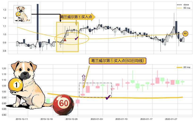 形态多维评估: ⚀ 2019-12-27-日显现 葛兰威尔均线 60日均线 第买①入点 走势反转见底信号,后市看涨,买进信号