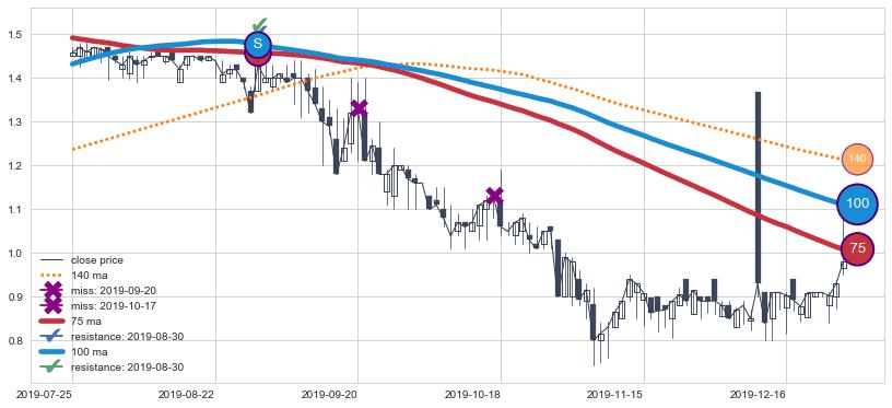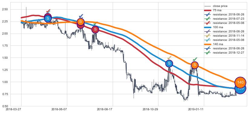 下跌趋势2018-03-27-2019-03-05,均线140, 75, 100确认关键阻力5处