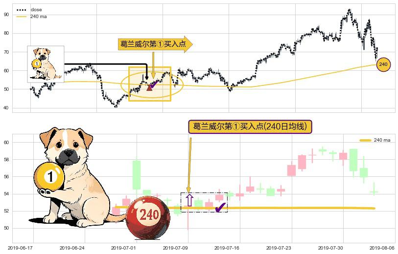 形态多维评估: ⚀ 2019-07-09-日显现 葛兰威尔均线 240日均线 第买①入点 走势反转见底信号,后市看涨,买进信号