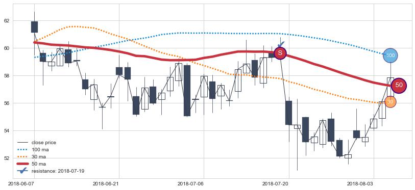 下跌趋势2018-06-07-2018-08-07,均线50确认关键阻力1处