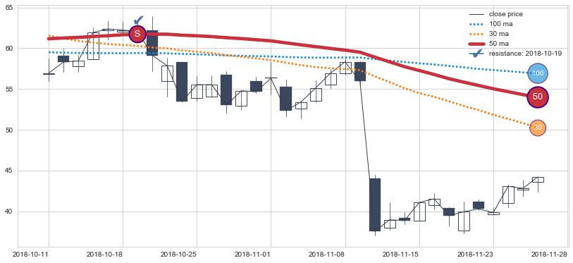 下跌趋势2018-10-11-2018-11-28,均线50确认关键阻力1处