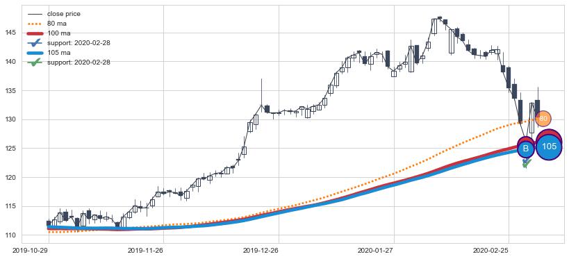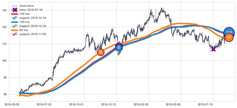 上涨趋势2018-05-09-2019-08-14,均线80, 105, 100确认关键支撑2处