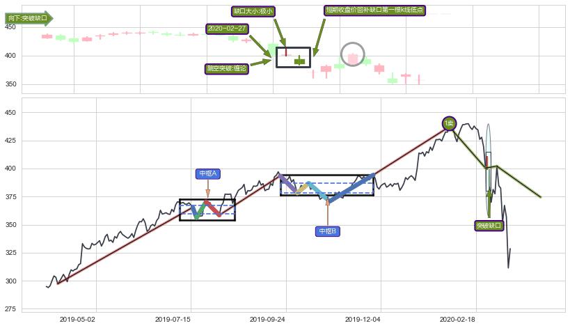 ➢ 收盘价(2020-02-03: 423.86 )→再次回踩→第一根k线高点(2020-01-23: 429.56 )