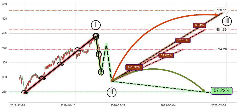 ➣ 高概率大级别循环上涨浪被破坏,反转向下(突破5浪起点)概率57.22%