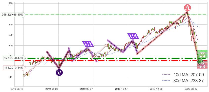 ♘ 支撑价格位171.20,可信任强度79.87%,距离最后交易2020-03-13形成的收盘价格176.75相差 -3.14%