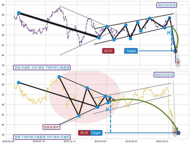 ➣ 升旗形:下跌target达成后 → 猜想下跌动能竭尽反转上涨 → 机会信号 → 大趋势均值回复