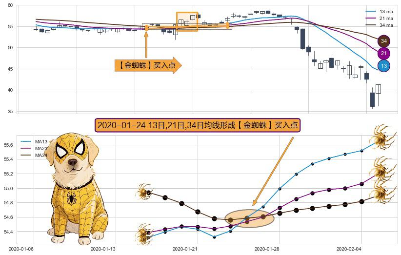 形态多维评估: ⚀ 2020-01-24日显现 13日-21日-34日均线 【金蜘蛛】买入点 看多信号,后市看涨,买入