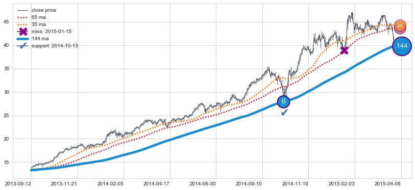 上涨趋势2013-09-12-2015-04-06,均线144确认关键支撑1处