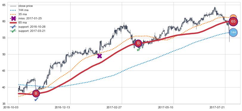 上涨趋势2016-10-03-2017-07-27,均线65确认关键支撑2处