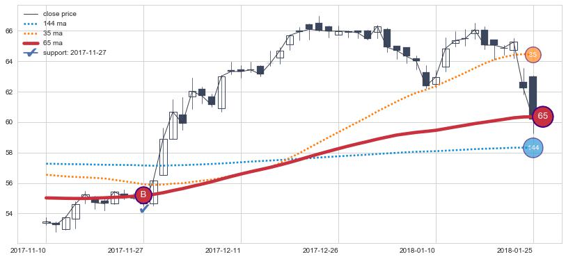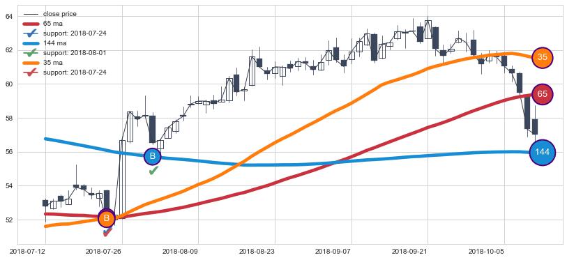 上涨趋势2018-07-12-2018-10-11,均线144, 65, 35确认关键支撑2处