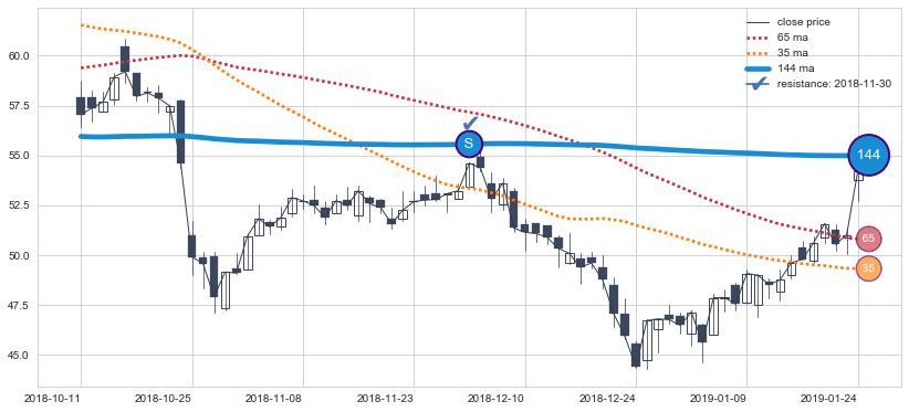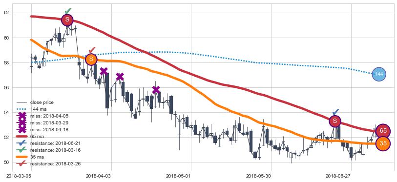 下跌趋势2018-03-05-2018-07-06,均线65, 35确认关键阻力3处