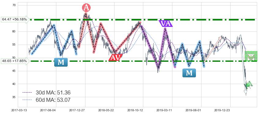 ➢ 【已达成】最小【整理】第一目标价格→(2020-03-12: 42.07 ), 后续继续【整理】下跌动力依然存在,下跌空间适中