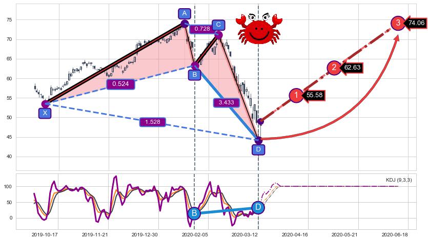 | 3 🅚:降势受阻 ➕ 📡:谐波螃蟹已到达d点:猜想c下行到达d点后报复性拉升上涨(均值回复) ☞ 看多信号 ⇥ 【🅚线】交织【图形】⇥ 综合量化分数: 51 | > |
