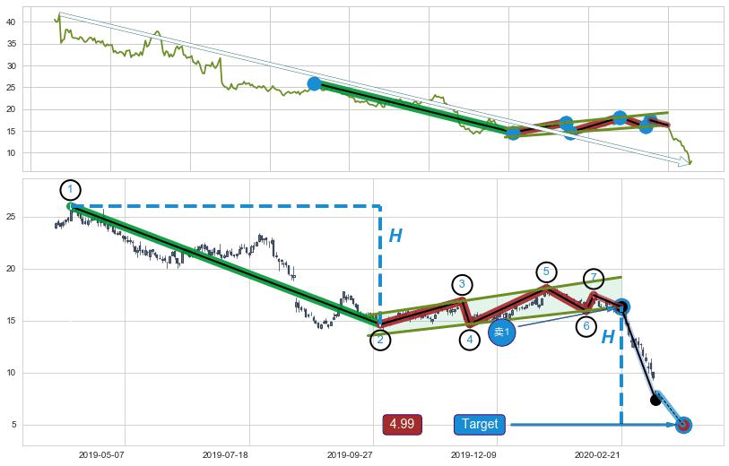 | 4 🅚:【死亡谷】卖出点 ➕ 📐:升旗形下行突破支撑位破位, 猜想持续下沉下跌,被突破的支撑位已变为阻力位 ☞ 看空信号 ⇥ 【均线】交织【图形】⇥ 综合量化分数: 47 | > |
