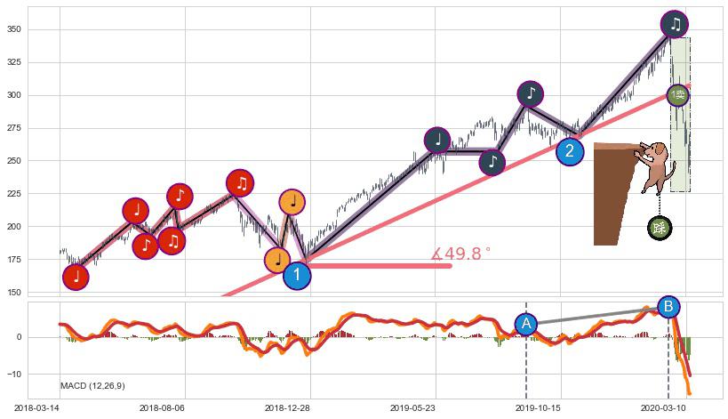 ➣ 2018-04-06-2020-03-11上升趋势存在反转[风险],其原上升趋势的支撑位(307.09)已破位[强阻力信号],原上升趋势角度: 49.8˚