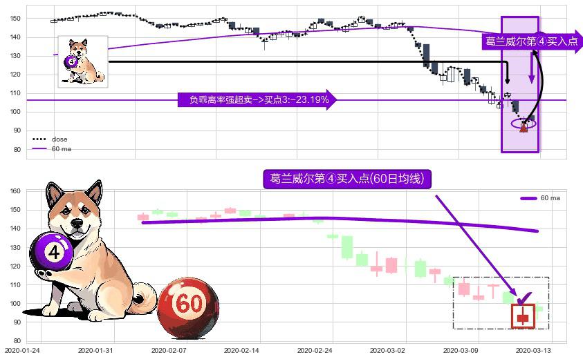 形态多维评估: ⚀ 2020-03-12-日显现 葛兰威尔均线 60日均线 第④买入点 下降趋势均值回复的短线反弹信号,后市看涨,买进信号
