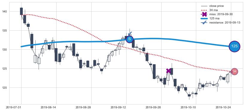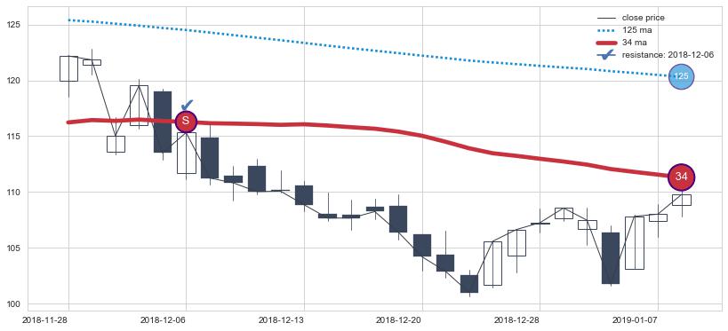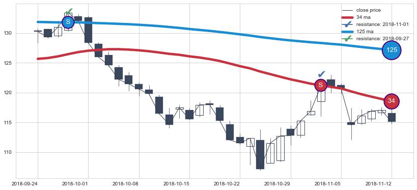 下跌趋势2018-09-24-2018-11-12,均线34, 125确认关键阻力2处