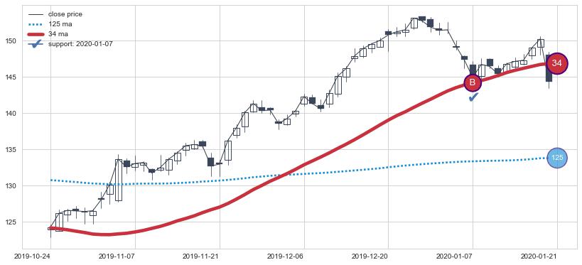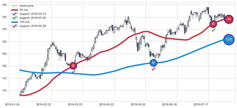 上涨趋势2019-01-24-2019-07-31,均线34, 125确认关键支撑3处