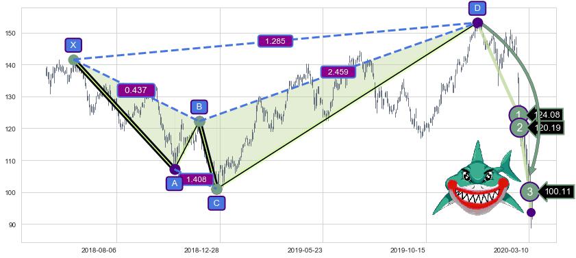 ➣ 已完成【鲨鱼】形态起点X: 2018-06-06, 终点D: 2019-12-26, 共393交易日
