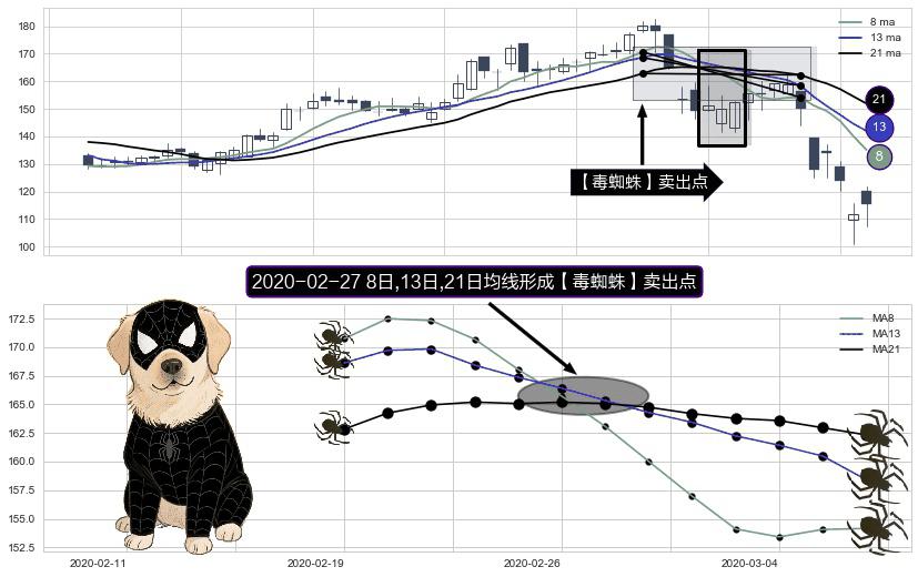 ⚀ 2020-02-27日显现 8日-13日-21日均线 【毒蜘蛛】卖出点 看空信号,后市看跌,卖出