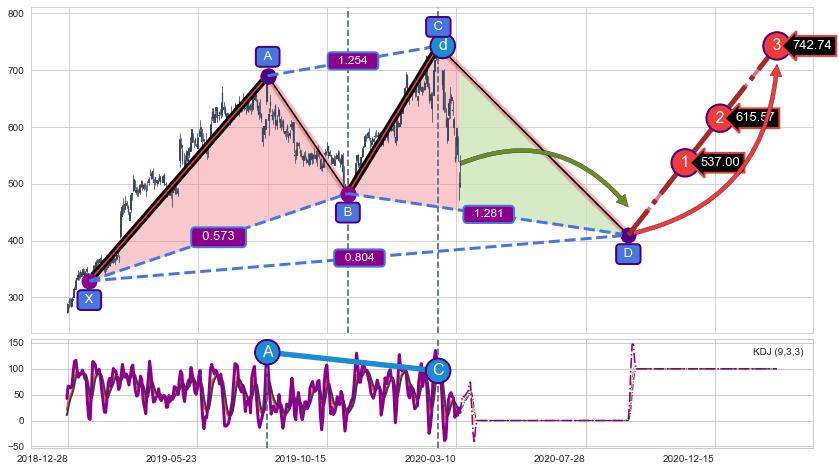 ➣ D点拟合预测价格409.83,距离最后交易收盘价格535.69相差 -23.49%