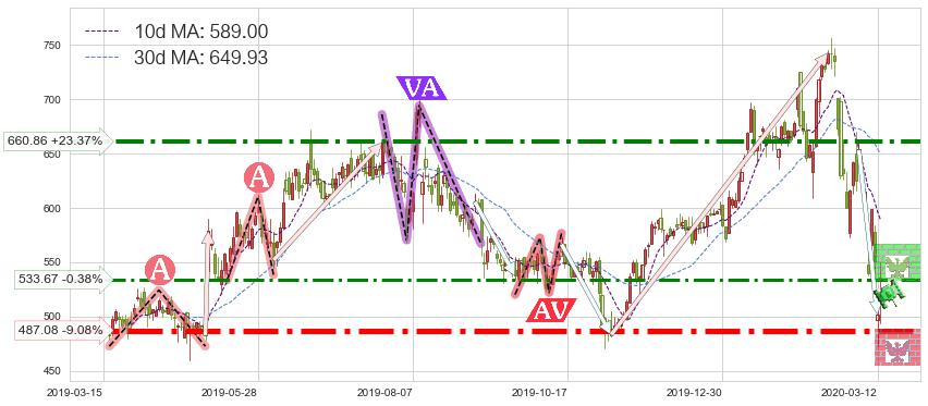 ♘ 支撑价格位487.08,可信任强度93.77%,距离最后交易2020-03-13形成的收盘价格535.69相差 -9.08%