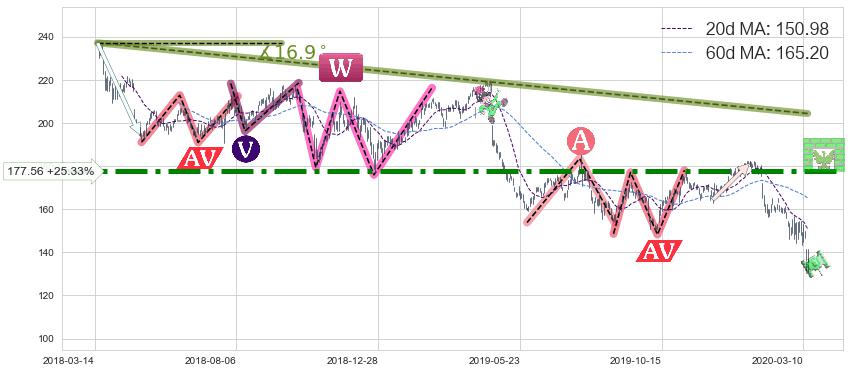 ♘ 阻力价格位177.56,可信任强度93.46%,距离最后交易2020-03-13形成的收盘价格141.68相差 +25.33%