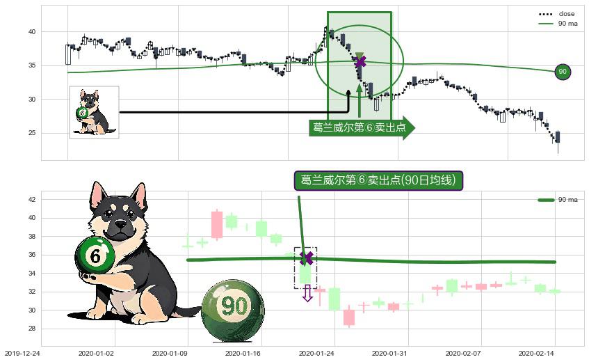 形态多维评估: ⚀ 2020-01-22-日显现 葛兰威尔均线 90日均线 第⑥卖出点 走势反转见顶信号,后市看跌,卖出信号