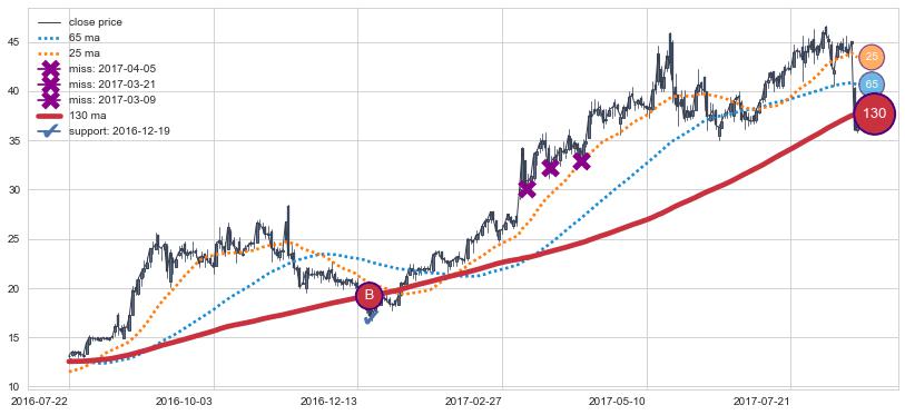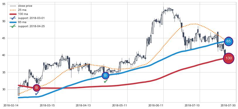 上涨趋势2018-02-14-2018-07-30,均线65, 130确认关键支撑2处