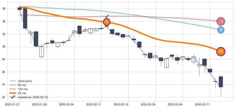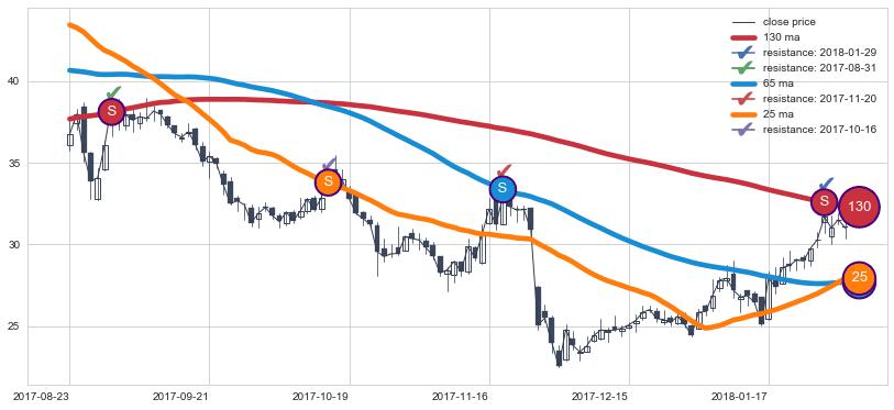 下跌趋势2017-08-23-2018-02-01,均线65, 130, 25确认关键阻力4处