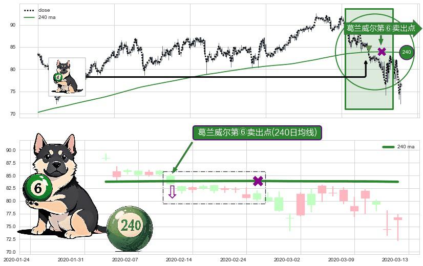 形态多维评估: ⚀ 2020-02-12-日显现 葛兰威尔均线 240日均线 第⑥卖出点 走势反转见顶信号,后市看跌,卖出信号