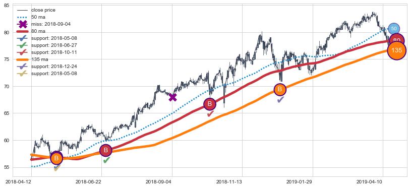 上涨趋势2018-04-12-2019-04-16,均线80, 135确认关键支撑4处