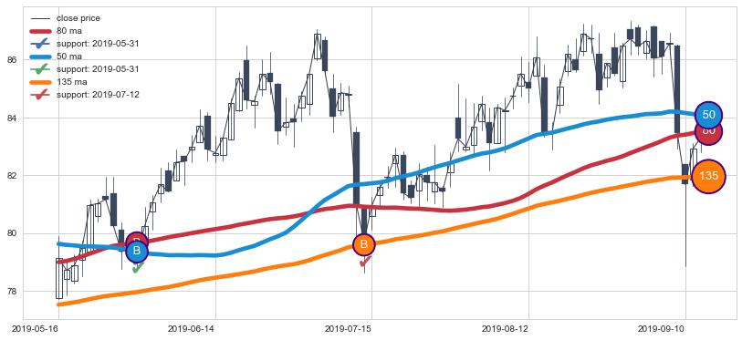 上涨趋势2019-05-16-2019-09-12,均线80, 50, 135确认关键支撑2处