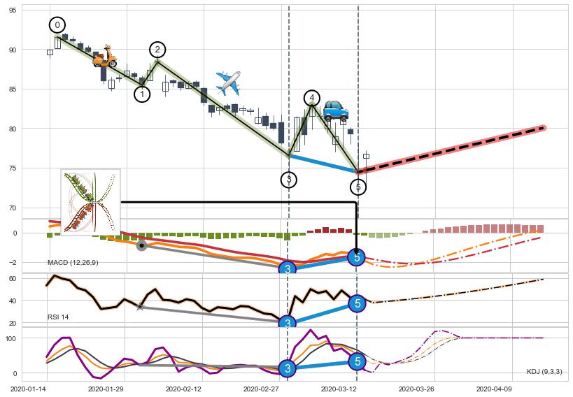 ➢ 1,3,5驱动浪MACD, RSI, KDJ走势都出现【常规背离】反转信号增强